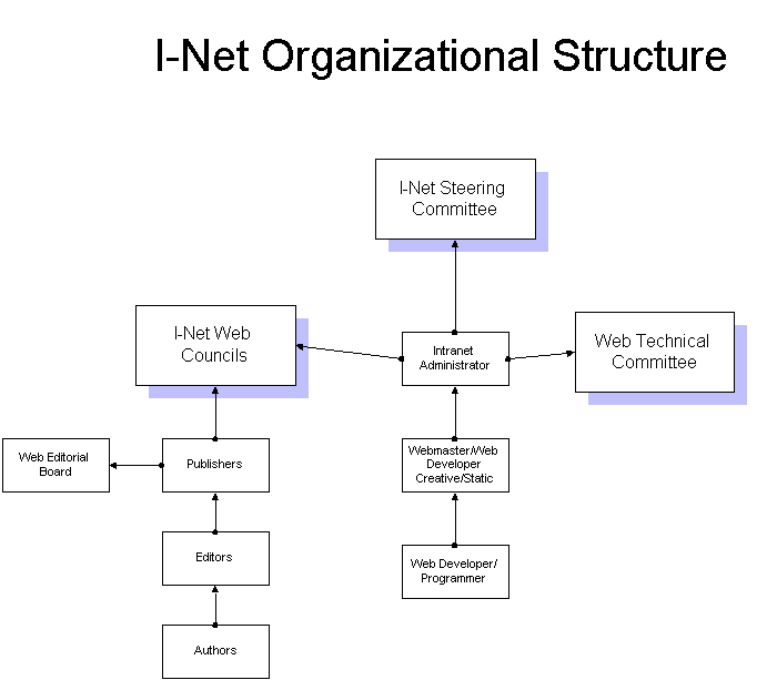 I-Net Organizational CommitteesThe I-Net Steering Committee is composed of top level management within the organization. This committee is responsible for approving policies, procedures and standards submitted by the various I-Net Web Councils. The charter and responsibilities of the I-Net Web Councils are determined by the I-Net Steering Committee. The I-Net Steering committee will ultimately control and assure coordination for all the I-net publication activities.